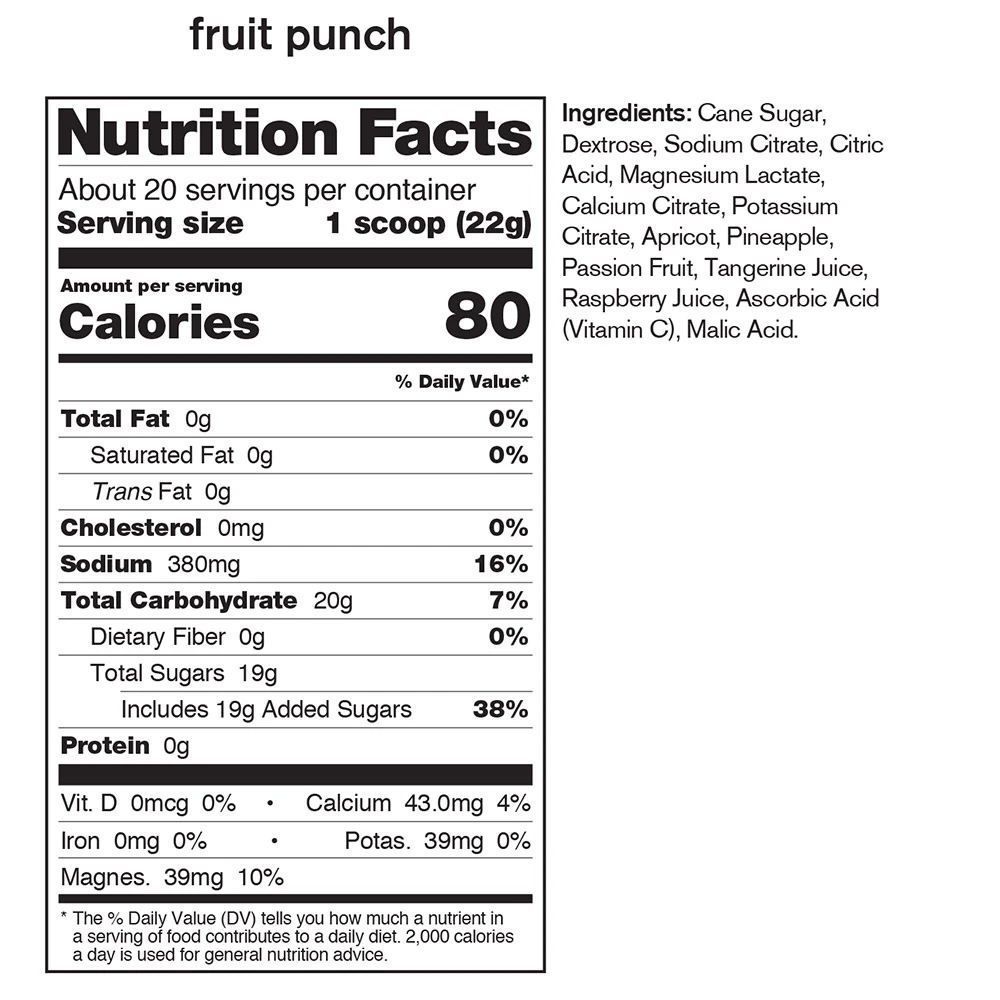 Cane Sugar, Dextrose, Sodium Citrate, Citric Acid, Magnesium Lactate, Calcium Citrate, Potassium Citrate, Apricot, Pineapple, Passion Fruit, Tangerine Juice, Raspberry Juice, Ascorbic Acid (Vitamin C), Malic Acid.